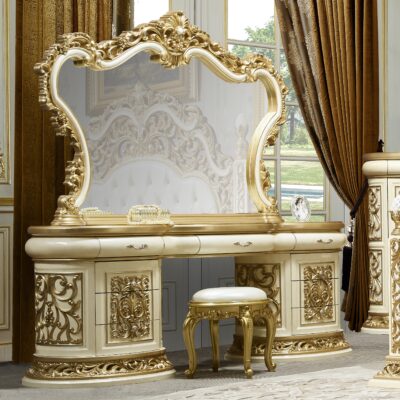 The HD-1812 Bedroom Collection radiates timeless elegance and grandeur, transforming your bedroom into a regal retreat. Anchored by a lavishly upholstered bed adorned with intricate carved details and a luxurious cream-and-gold finish, this collection exudes sophistication. The matching dresser, mirror, and nightstands boast ornate craftsmanship, blending practicality with opulence. Perfectly designed to create a harmonious and refined ambiance, the HD-1812 collection elevates your bedroom into a space of unmatched luxury and comfort.