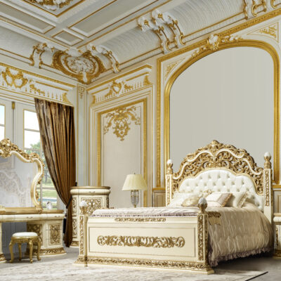 Baroque elegance at its finest is everything the HD-8088 bedroom collection signifies. A tall crowned, intricately carved bed featuring silver leather, an exquisite dresser with felt lined drawers, pedestal nightstands, a mirror to shine bright and the finest fainting bench money can buy, makes this a royal collection. Finished in a metallic silver highlighted with gold throughout, this is a stunning collection.
