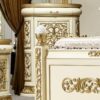 The bedroom set from the HD-958 collection embodies luxurious and regal aesthetics. The bed immediately captivates with its grand-scale headboard design, featuring extensive hand carvings and exquisite scrollwork accented with touches of antique gold. The bed bench is upholstered in white bonded leather and the headboard panels are adorned with crystal button-tufted detailing. The nightstand boasts charming decorations and impressive carved legs with a hint of gold tone. Meanwhile, the dresser combines bold carvings on the mirror’s frame with a belle silver coating and antique gold accents. With four doors, the dresser offers spacious storage for personal items.